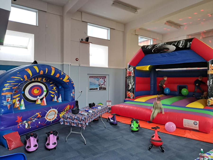 Get ready for an unforgettable party experience with our MEGA Drive By Shoot Out Party! This incredible package includes a huge 15x18ft Racing Car Bouncy Castle, perfect for bouncing and racing fun. With its vibrant colors and exciting design, it will be the centerpiece of any party!