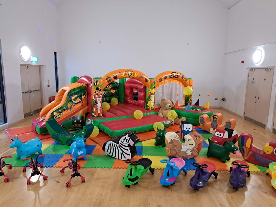 But the adventure doesn't stop there! Our deluxe Jungle themed soft play package takes the excitement to the next level. Set on a colorful soft play matting area, kids can explore a variety of animal-themed soft play equipment, including space hoppers, diddi cars, and ride-on toys. They can even cuddle up with our huge teddy called George, creating unforgettable memories.